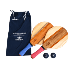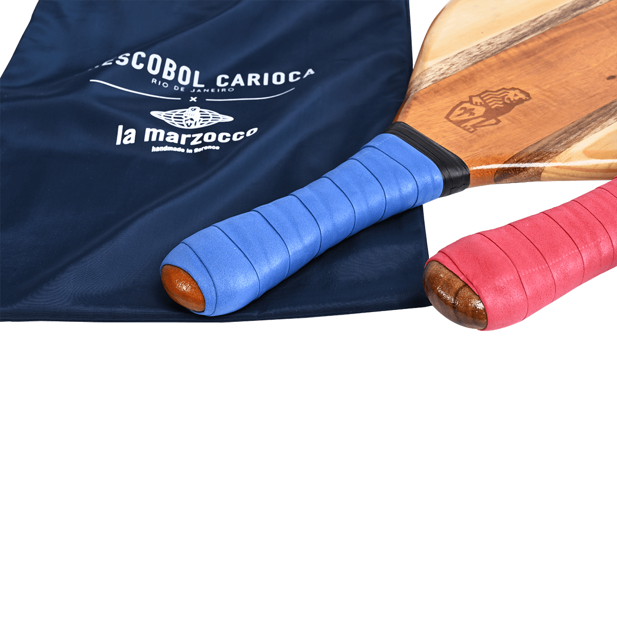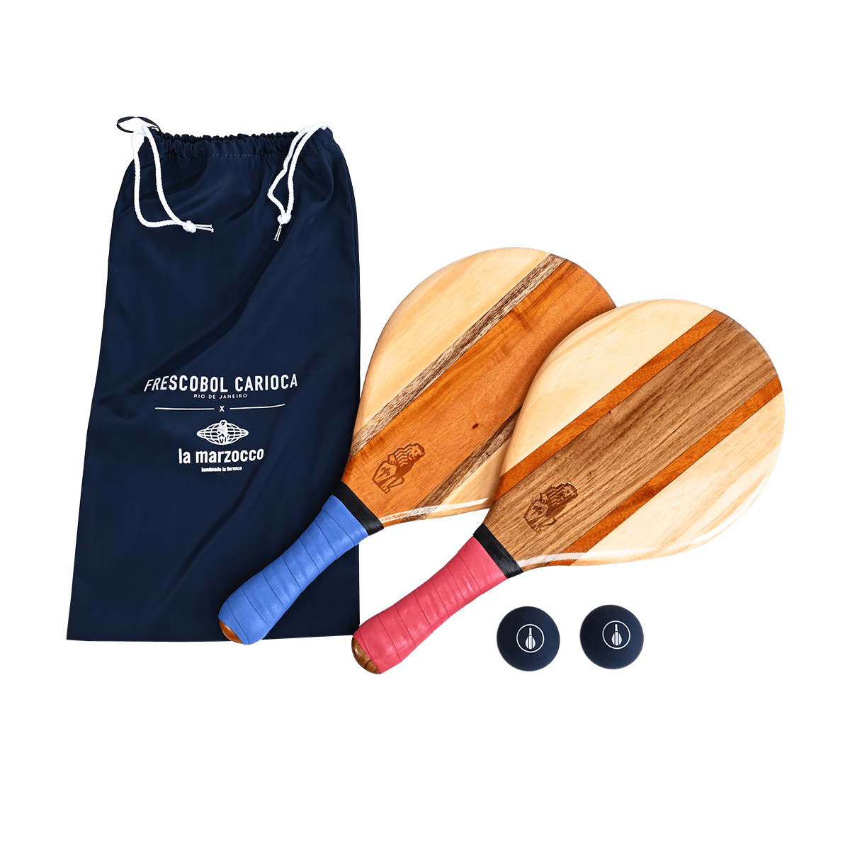 This Frescobol Carioca x La Marzocco Beach Bat is expertly handcrafted by local artisans, known as the marceneiros, from five pieces of sustainably-sourced Brazilian wood offcuts and heat-stamped with La Marzocco logo, before being coated with a natural waterproof and sand-resistant resin and finished with a neoprene grip.